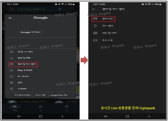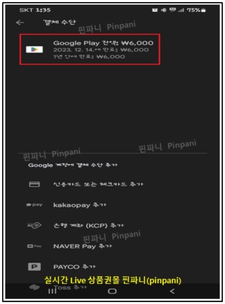 핀파니에서 구글 기프트를 휴대폰, 신용카드, 계좌이체 등의 방법으로